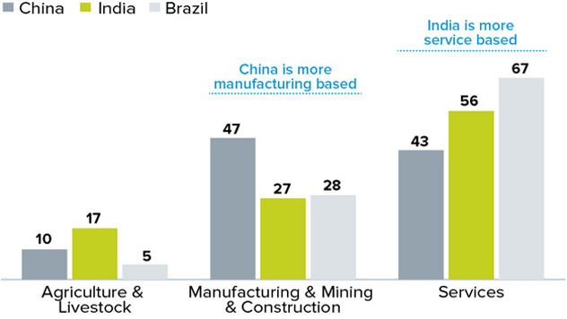f The perception of India as an agrarian economy is outmoded; agriculture accounts for only 17% of GDP versus 56% for services and 27% for industry.49