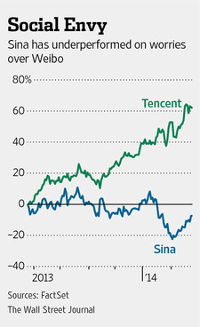 Sina shares are down over 10% since a January government report said China’s total microblog users fell last year. Some whispered that Weibo could be the MySpace of China. Investors fretted the decline was due to a government crackdown on politically outspoken bloggers who are some of Sina’s biggest, though far from its only, draws. Worse is the fear that users are migrating to rival Tencent’s mobile-messaging platform WeChat. Tencent’s shares are up 17% in the meantime.