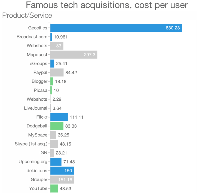 [Update 5:25pm PST: To put the price of the WhatsApp acquisition and others in context, here’s a chart comparing the acquisition cost per user for most of the major consumer space acquisitions from the past fifteen years. Click through to see the original interactive chart that includes details on each deal.]