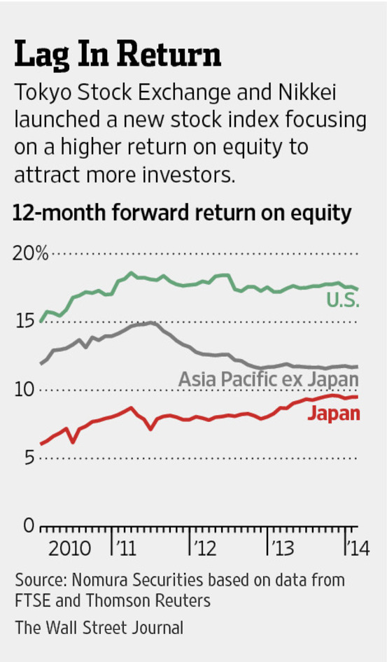 Return on equity is a measure of how well companies use shareholders’ money to generate income. Generally speaking, Japanese companies perform poorly on ROE, making just $9.5 a year for every $100 of shareholder equity, compared with $17.4 at U.S. companies and $11.7 at Asian companies, excluding those from Japan, according to Nomura Securities.