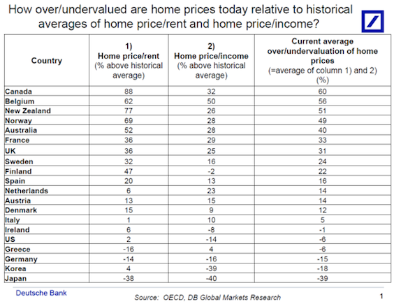Deutsche Banks’s house-price-to-rent index says Canada has the most expensive housing market in the world – 60% over-valued…