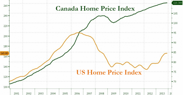 As it’s home price index hardly missed a beat while the US plunged… (different scales but point is to illustrate drastic difference when financial crisis started – and where the liquidity went…)