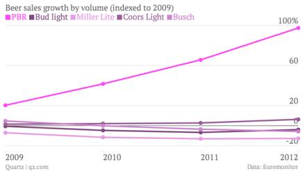 PBR’s rapid growth comes amidst a steady fall in American domestic beer consumption. The US is switching out beer for wine and other spirits, according to the market research company Mintel. The drop-off has been especially acuteamongst young adults, and particularly unkind to lower-end brewers, like Miller and Budweiser—which both produce light lagers similar to PBR. The beer market, on the whole, is shifting toward craft brewers—which Pabst is decidedly not.