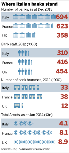 Italy has almost 700 banks, employing 310,000 people in 33,000 branches. The banks’ total assets are €3.5tn, worth 225 per cent of gross domestic product.