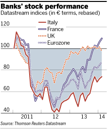Mr Gallo at RBS admits that “reform is not simple in Italy, with intricate cross-shareholdings and shared directorships complicating efforts.” He adds: “However, reform and recapitalisation of the banks is critical to get credit flowing to the real economy again.”