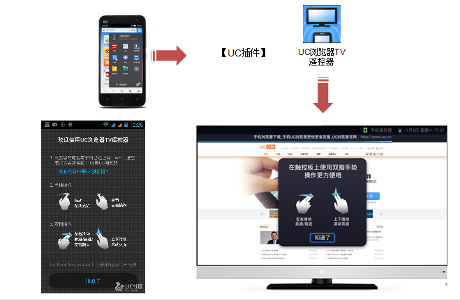 The TV browser comes equipped with online video libraries, online shopping, and plugins that turn your smartphone into a TV remote. For now, the browser is only in Chinese. Users’ UC accounts sync across all their devices.