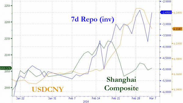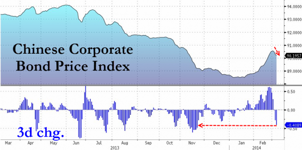 Ever since the specter of the first real domestic default on a Chinese corporate bond hovered over the markets, the Chinese credit markets have been leaking lower. The last 3 days have seen the biggest drop in Chinese credit markets in almost 4 months. That situation,wistfully occurring half way around the world while US equity markets press on to ever more exuberant (and ignorant) heights, meant at least 3 other Chinese firms pulled their bond issues today and, as Reuters reports, has “triggered widespread upheaval in the bond market.” Banks are awash with liquidity (as indicated by low repo rates) but clearly unwilling to lend and external investors are now running scared.