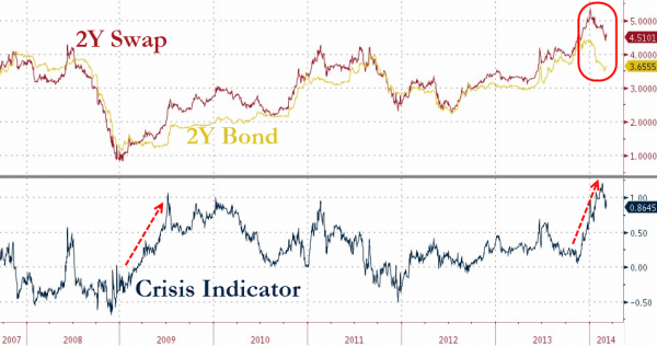 This is very negative for the Chinese economy which now more than ever is reliant on credit as its growth-driver… and the China credit-crisis indicator remains flashing red (2Y Swap – 2Y Bond spread)…