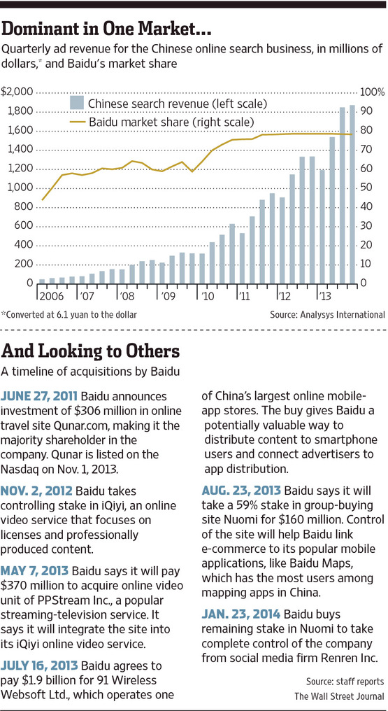 To adjust to the challenge, Baidu has focused efforts on developing products for smartphones, like its search and map applications, and has also gone on a buying spree, capped by a $1.9 billion acquisition of 91 Wireless Websoft Ltd. Last month, Baidu said it did not expect profits to grow in 2014, despite rising revenue, because of heavy spending to continue to improve its appeal to smartphone users.