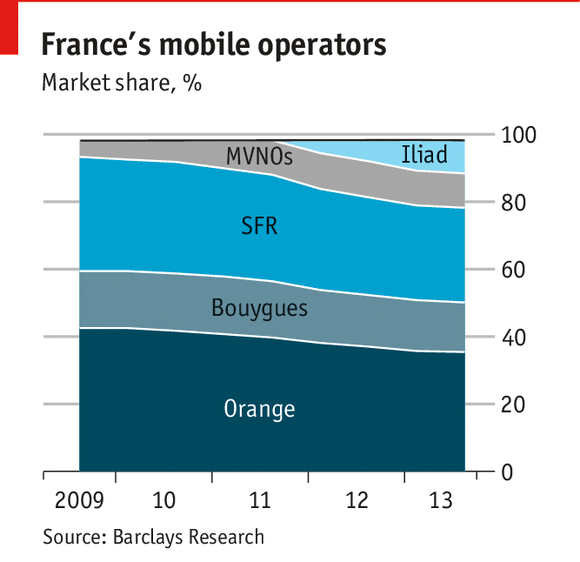 Since the beginning of 2012, when a new competitor, Iliad Group’s Free, crashed in with super-low prices and soon snatched more than 10% of the market (see chart), revenues of the three incumbent operators have tumbled. At SFR, the second-biggest, the price of the average mobile contract these days is €24 ($33) a month, €10 lower than three years ago. In recent days Orange, the market leader, and Bouygues Telecom, the number three, have both reported lower sales and gross profits in 2013.