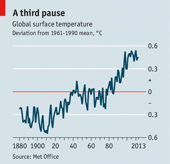 It is also worth remembering that average warming is not the only measure of climate change. According to a study just published by Sonia Seneviratne of the Institute for Atmospheric and Climate Science, in Zurich, the number of hot days, the number of extremely hot days and the length of warm periods all increased during the pause (1998-2012). A more stable average temperature hides wider extremes.