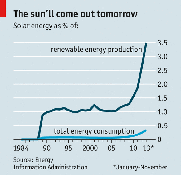 A bigger test will come in 2017, when the federal government’s solar-investment tax credit drops from 30% to 10% (unless Mr Obama can convince Congress otherwise). Still, says Shayle Kann at GTM, this will be no “death knell”; it will simply eliminate some marginal projects. And by then there may be a revival of Ivanpah-style solar-thermal plants, as energy-storage technologies improve and utility firms look to them to provide steady power throughout the day.