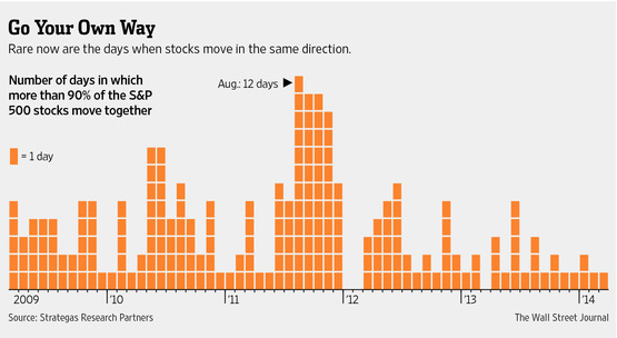 Another data point: Since August 2013, there have been an average of 1.3 days a month when 90% of stocks in the S&P 500 moved in the same direction, whether up or down, according to Strategas. That marks a sharp drop from August 2011, when there were 12 days when 90% of stocks in the S&P 500 moved in the same direction during a single session.