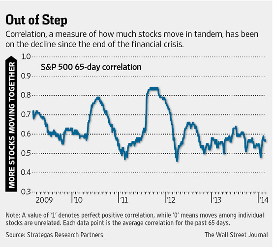 But there have been head fakes before when it comes to declines in correlations. Investors and advisers say if extended turmoil returns to the markets, perhaps due to a worsening of the situation in Ukraine or serious financial troubles in China, stocks likely would start moving in lock step again, disadvantaging stock pickers. And indexing continues to draw money: Passively managed funds saw inflows of $63.8 billion last year and $9.8 billion so far in 2013.