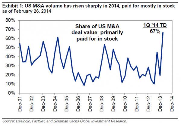 Well, not if in the process of purchasing they can get the momentum chasing algos and what little retail dumb money is left to piggyback along, and generate additional upside, which then allows companies to use their overvalued equity as M&A currency. Confirming precisely that corporations now see their stocks as the most highly valued ever, is that the share of M&A primarily paid for in stock is now at an all time high! It’s ok though – nothing quite like issuing record amounts of debt (as we said would happen back in 2012) to buy back one’s stock so that the same stock can hit record levels and then be used as currency to purchase other companies – as Homer Simpson would say, a “tidy little package.”