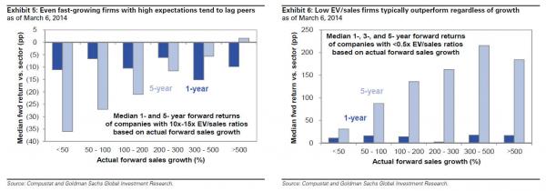 Goldman then wonders, with the market at full valuation what amount of growth is necessary to sustain the lofty valuations and fulfill the expectations embedded in premium multiples. To answer the question, the vampire squid analyzed the historical performance of stocks across the Russell 3000, examining EV/sales ratios in order to include smaller growth companies. Its findings: