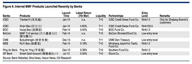 In recent weeks, numerous banks including the big banks (ICBC, BOC) and joint stock banks (CMB, MSB, Ping An Bank) have started to launch their own internet T+0 redemption MMFs (Figure 9). Bank MMF returns are somewhat lower than those offered by the internet companies but they are still significantly higher than bank deposit rates. We believe this is a critical development – to defend their customer base, banks have no choice but to launch their own MMF products and cannibalize their own deposit base. At least they are cannibalizing their own customers with their own products rather than someone else’s and hence banks can still hope to retain the customer relationship. This trend of deposit disintermediation by MMFs clearly has destructive implications for the sector.