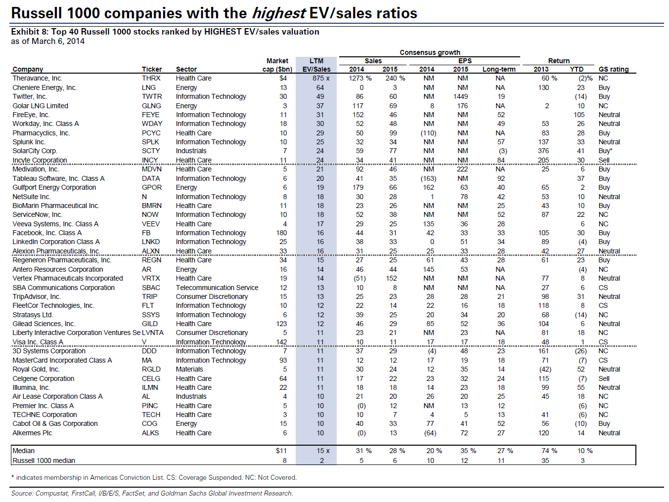So just what are these most overvalued stocks? To answer this question David Kostin screens for those Russell 1000 companies with the highest EV/Sales ratios (because in the new normal actual earnings – not the non-GAAP, adjusted, recasted, added back mumbo jombo, and certainly cash flows no longer matter), and finds 40 companies, with a ratio between 10x and 875x (median of 15x compared to the overall Russell’s 2x), that fit the bill (and which have returned 10% YTD compared to just 3% for the broader index).
