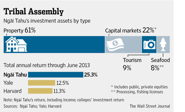 The tribe compares its investment approach to college-endowment funds such as those operated by U.S. Ivy League schools, which typically hold assets for years and favor those that generate steady returns. Ngāi Tahu now has total group assets in excess of NZ$1.03 billion, has paid out more than NZ$200 million in dividends to its people, and in the year through June 2013 had a 25.3% return on its portfolio. Last year, Yale and Harvard reported returns of 12.5% and 11.3%, respectively.