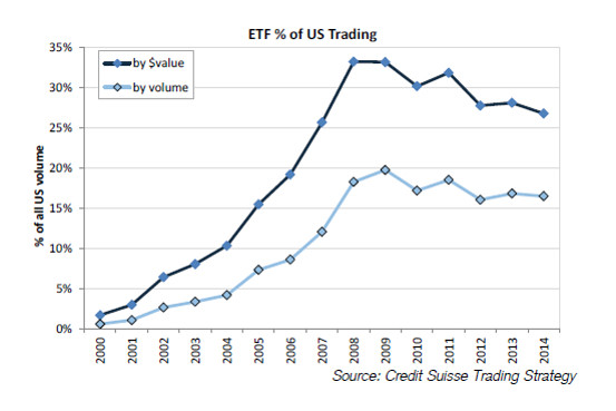 As big macroeconomic headlines recede, ETFs are falling out of favor. ETF volumes have dipped this year to about 16.5% of total equity volumes, down from 16.7% in 2013, according to analysts at Credit SuisseCSGN.VX -1.59% Trading Strategy. The data suggest that investors are increasingly favoring trades in individual stocks.