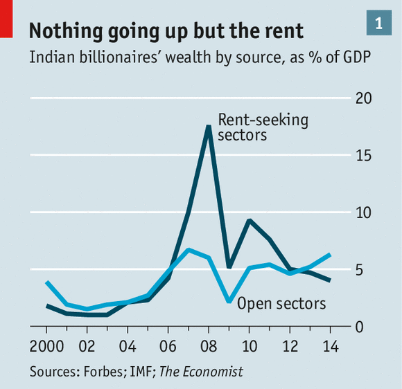 Such scandals have rocked Asia’s third-largest economy in the past decade. A lot of transactions that put public resources into private hands—allocations of radio spectrum, for example, and of credit from state banks—have come under suspicion. Of the ten biggest family firms by sales, seven have faced controversies. The brash new tycoons who came of age during the boom years of 2003-10 are under a cloud, too. Before he became boss of the central bank last year, Raghuram Rajan worried publicly that India could start looking like an oligarchy along the lines seen in Russia: “too many people have got too rich based on their proximity to the government.”