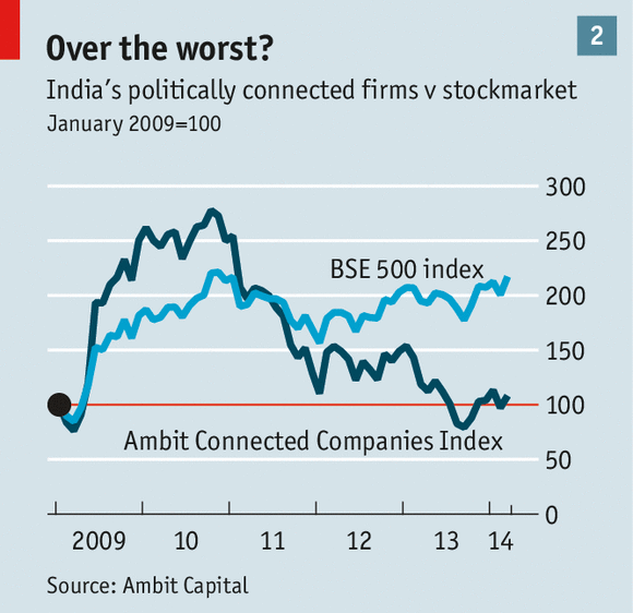 And the messy response to a decade of graft, though inefficient, has started to change financial incentives. Sporadic court actions—mining suspended in some areas, some spectrum allocations being cancelled—have made rent-seeking less profitable, and foreign investors have begun to shun such sectors. Ambit’s index of politically linked firms, which did well in the late 2000s, has underperformed badly since. India has only a middling rank on our cronyism index.