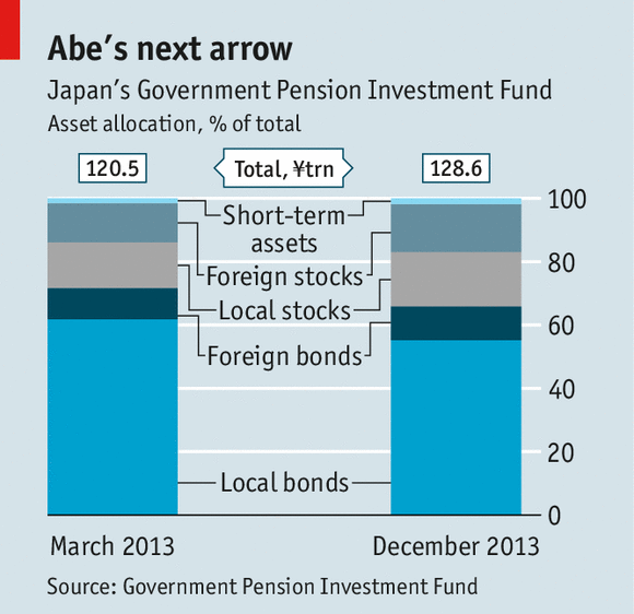 WHEN George Soros, a billionaire investor, met Shinzo Abe, the prime minister of Japan, at Davos in January, he hectored him about asset management. Japan’s massive public pension fund needed to take more risk, he reportedly told Mr Abe. With ¥128.6 trillion ($1.25 trillion) of assets, the Government Pension Investment Fund (GPIF) is the world’s biggest public-sector investor, outgunning both foreign rivals and Arab sovereign-wealth funds. Yet its mountain of money is run by risk-averse bureaucrats using an investment strategy not much more adventurous than stuffing bundles of yen under a futon. It keeps around two-thirds of assets in bonds, mostly of the local variety. Like an investing novice, it mostly follows indices passively, and hardly ventures abroad.