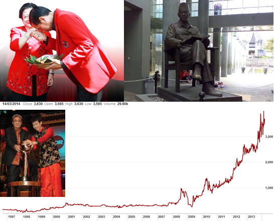 Top left: Jakarta Governor and Indonesian Democratic Party of Struggle (PDI-P) presidential candidate Joko “Jokowi” Widodo bows to party chairwoman Megawati Soekarnoputri after receiving a piece of a ceremonial yellow-rice cone during the 41st anniversary of the PDI-P in Jakarta; top right: Soekarno statue and grave on the back where the gapura (gateway) is. Bottom: Eddy Hartono of ADR Group and PT Selamat Sempurna (SMSM IJ) – Stock Price Performance, 1996-2014