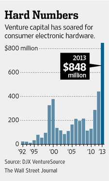 The result: U.S. venture capitalists completed a record 31 fundraising deals for consumer-electronics makers last year, eclipsing the previous high of 29 in 1999, according to DJX VentureSource. They pumped $848 million into hardware startups, nearly twice the prior record of $442 million set in 2012.