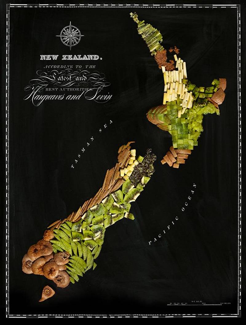 New Zealand photographer Henry Hargreaves has always liked to play with his food. In his newest collaboration with food stylist Caitlin Levin and typographer Sarit Melmed, Hargreaves takes playing with food to another level by creating maps that use the iconic foods of the countries and continents that they depict.