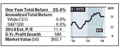 Ford was heading toward a bankruptcy filing in 2008. Last year, it celebrated its best pretax profit in a decade. Credit for executing this turn goes to Mulally, 68, who sees even higher earnings in 2015.