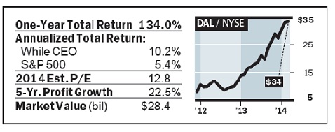 Airline stocks were lousy investments for decades, but Anderson, who stepped into Delta’s cockpit just as the carrier was emerging from bankruptcy protection, helped change that perception. By cutting capacity, raising fares and fees, refurbishing used jets instead of buying new ones, and making peace with labor, he has set the course for years of profitability. Indeed, Delta’s earnings soared 75% in 2013. What’s more, the company issued its first dividend in a decade, paying six cents per quarter, as part of its plan to return $1 billion to shareholders over three years.