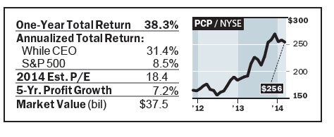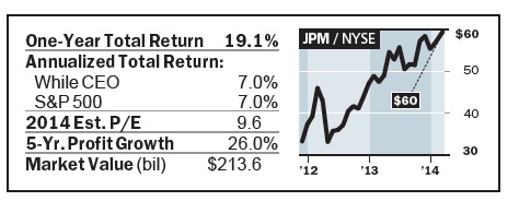 One of the most controversial CEOs on our list is Jamie Dimon of JPMorgan Chase . Many would argue that Dimon doesn’t deserve accolades, given the series of problems during his eight-year tenure as CEO, including the London Whale trading fiasco in 2012, the Bernie Madoff mess, and some $20 billion of legal settlements last year, most related to mortgage-related activities. Our view is that Dimon deserves to stay because he has built one of the strongest global banking franchises, which could produce $25 billion in after-tax profits this year. Dimon seems as committed as ever to the bank, its employees, and its shareholders, and could be on the job for at least a few more years.