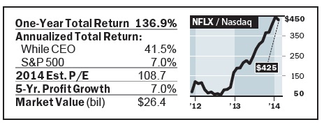 The CEO is even shaking up Wall Street. Last year, Hastings began hosting live video discussions about quarterly earnings, replacing the traditional conference call. His swagger is paying dividends. Netflix shares soared 298% in 2013, the best performance in the Standard & Poor’s 500.