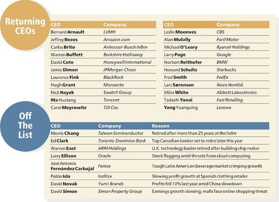 We set a high standard for keeping CEOs on our list. David Novak of Yum! Brands is gone because the company’s profit growth stalled last year amid problems in Yum’s key market: China. José Antonio Fernández Carbajal of Femsa, the Mexican Coca-Cola bottler, is off because of slowing profit growth amid challenging conditions throughout Latin America. Larry Ellison built the second-largest software company behindMicrosoft, but Oracle looks vulnerable to upstarts offering cloud-based software, and its shares are flat in the past year. David Simon, CEO of Simon Property Group, has been removed due to a modest profit slowdown and a hazier outlook for malls as more Americans do their shopping online.