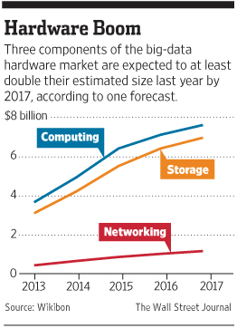 As large companies collect, analyze and store increasing quantities of information, the expense of adding servers, hard drives and other equipment is threatening to crimp their big-data plans. Indeed, hardware sales related to corporate-data projects are expected to more than double to $15.7 billion in 2017 from $7.16 billion last year, according to Wikibon, a Marlborough, Mass., research organization.