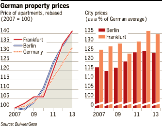 In Westend, the most expensive district of Germany’s fifth most populous city, prices rose by almost a quarter between 2011 and 2013 to €6,000 per square metre, according to data from property researchers BulwienGesa. Across Frankfurt they are up by 18 per cent to €4,000 per square metre. An average apartment of around 100 square metres would cost €400,000, up from €340,000 in 2011.