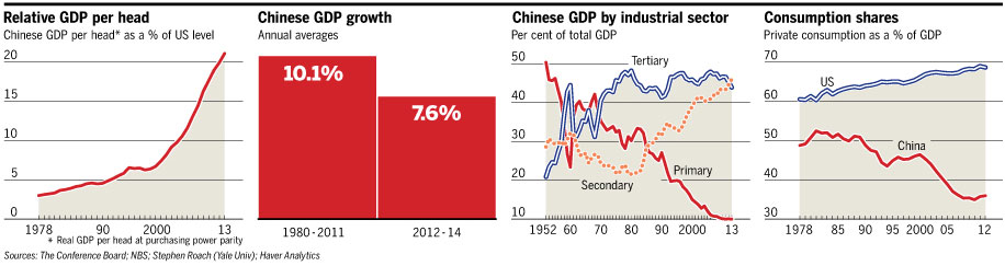 Third, the economy has itself changed. The potential growth rate has fallen to 7-8 per cent, partly because of a shrinking labour force; excess capacity has become massive even by Chinese standards; financial risks have risen, driven by excessive local authority borrowing, housing bubbles and growth of shadow banking; the country is now more than 50 per cent urbanised but its cities suffer a range of ills, including pollution. Finally, the resource-intensive growth pattern is hitting limits, notably of water, which is not a directly tradeable commodity.