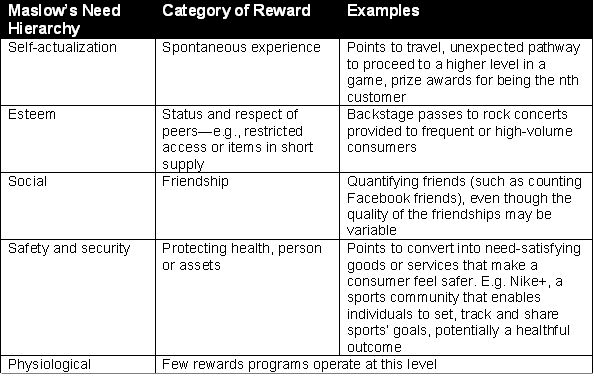 Consumers are now spending more time playing online games and using new media than watching television. As a result, marketers are now focused on how to provide both short-term stimuli and longer-term recognition and rewards. Online loyalty programs let consumers use points for virtual rewards where the rewards are more or less without “real” value. For example, playing virtual games such as MyTown or Farmville allows users to obtain points and use the points within the game. Sometimes the points are awarded for game accomplishments, but points or benefits can often also be bought. The motivation for collecting the points is to improve a player’s score, performance or status within the game, essentially addressing a social need. By providing leader boards so that game players can see their status, games reinforce point-collecting habituation.