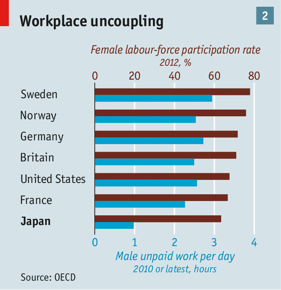 Corporate culture is by far the biggest obstacle for Japanese women. The practice of hiring graduates fresh out of university and employing them for their entire working lives makes it difficult for employees to take career breaks and seek new positions elsewhere afterwards. Promotion tends to be based on tenure and overtime, rather than on productivity and performance. And straightforward discrimination remains rampant. In a study that compared the reasons why Japanese and American college graduates leave their jobs, American women cited child care and looking after elderly relations as the main factors. Japanese women blamed dissatisfaction with their jobs and a feeling of being put into “dead-end” roles. The fact that their husbands, who spend more time at work than their counterparts in other developed countries, spend less time on child care or household chores, adds to the perceived need to stay at home (see chart 2).