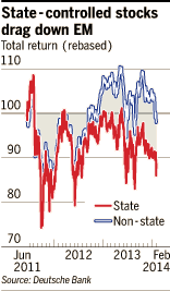 John-Paul Smith, head of emerging markets research at Deutsche Bank, has divided the stocks in the MSCI emerging markets index into those that are state controlled, and those that are not. Since September 2011, the non-state stocks have almost held their value, dropping only 2 per cent. State-controlled stocks fell 12 per cent.