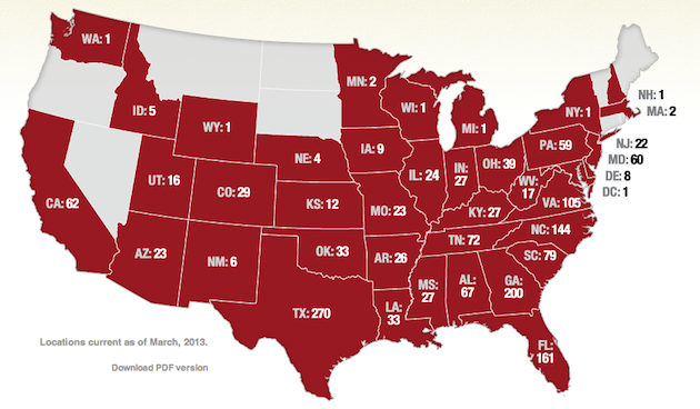The change atop the leaderboard appears undisputed: Yum! Brands (YUM), which owns KFC and has for years prided itself as “the leader in the U.S. chicken [quick-service restaurant] segment,” removed that very phrase from the company’s most recent annual report. But anyone in the northern half of the U.S. is likely scratching her head and wondering why she hasn’t seen Chick-fil-A outlets opening in the neighborhood. Check out the map below of Chick-fil-A locations, with a heavy concentration in the South.