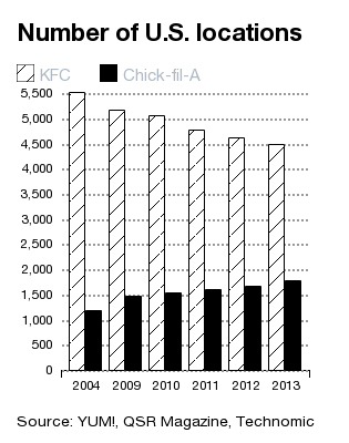 Last year Chick-fil-A only had about 1,775 U.S. stores to KFC’s 4,491. Yet in dollar terms the Colonel is coming up short even with that much larger footprint: Chick-fil-A’s 2013 sales exceeded its larger rival’s by nearly $800 million in the U.S. in 2013. And that’s with zero dollars coming in to Chick-fil-A on Sundays, when every restaurant is closed.