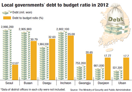 According to MOSPA, the city‘s debt stood at 2.8 trillion won against its 8 trillion won fiscal budget in 2012, resulting in a debt-to-budget ratio of 35 percent. This is the highest among all cities in Korea, except for Sejong, a newly-built city for a government complex.