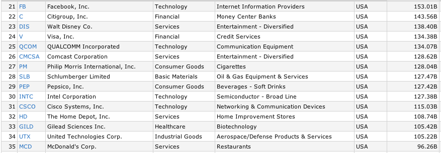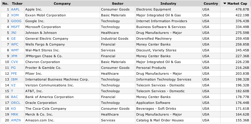 Below is a list of the biggest S&P 500 companies based on Friday’s close via FinViz.