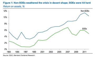 As Standard Chartered’s Stephen Green said, diversification of China’s SOEs has been going on for the past two decades. Even so, the Plenum went ahead and recognised them as the “main pillar” of the economy. Not exactly an excoriating cry for change in the face of this kind of performance: