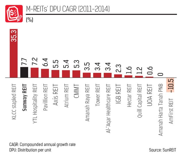 Sunway REIT is the manager of SunREIT with total portfolio assets valued at RM5.18bil as at June 30, 2013. Although it is often compared with KLCC REIT, it is a distant second to KLCC REIT’s RM16bil with its main competitors being Pavilion Real Estate Investment Trust (PavREIT by Malton Bhd), CMMT by CapitaMalls Malaysia REIT Management Sdn Bhd and IGB REIT.