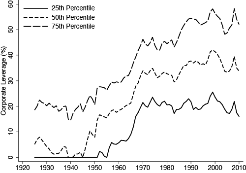 As Figure 2 shows, the dramatic increase in corporate indebtedness was a widespread and broad change in corporate financial policies. The figure shows the evolution of the cross-sectional distribution (25th percentile, median, and 75th percentile) of leverage in which the broad cross-section of firms increased their leverage ratios. In fact, the median firm had no debt in its capital structure in 1946, but by 1970 had a leverage ratio of 31%. Further, the shift was experienced in virtually every industry, further emphasising the systemic nature of the transition.