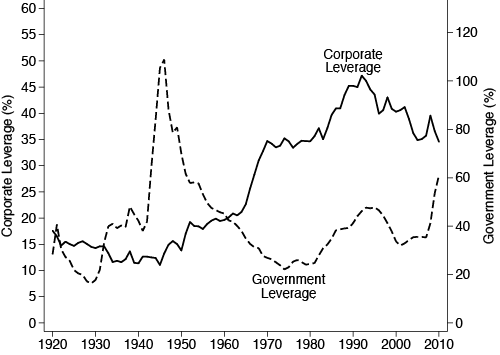 We view our analysis as a first step towards understanding the forces responsible for the substantial increase in corporate leverage over the last 100 years. Further analysis is needed to more fully explore the manner in which government debt crowds out corporate debt, as well as the channels by which maturation of financial markets has increased the corporate use of debt. At the same time, the scarcity of evidence that other common economic forces (such as corporate income taxes) have had long-run effects on corporate debt policy suggests that policymakers should be cautious about altering governmental policies in an attempt to reduce corporate debt usage.