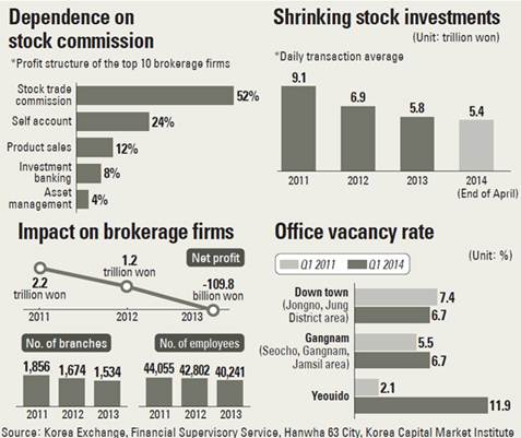 Last year, out of the 62 Korean brokerage firms, 28 reported net losses. Layoffs became frequent. The number of brokerage-firm employees shrunk from 44,055 to 40,241 between the end of 2011 and 2013. During the same period, the number of brokerage branches has been cut from 1,856 to 1,534.